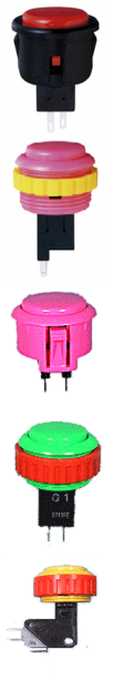 Los Pulsadores Los pulsadores deben ser capaces responder con firmeza a la presión de nuestros dedos sin oponer excesiva resistencia, a la vez que no bailar dentro de su barril y permitir la pulsación en cualquier punto de su superficie. El pulsador típico occidental, como el básico de Industrias Lorenzo —empresa que, como ya se ha mencionado, los fabrica para la mayor parte de las grandes casas americanas, como Happ—, basan su respuesta no solo en el microrruptor —cuya zona de contacto no está situada en el centro geométrico del botón—, sino también en un muelle, lo que genera una cierta imprecisión e impide la efectividad de todo el área del botón, que se ve agravado por la excesiva holgura del barril. Su resistencia a la pulsación es, generalmente, su mayor baza, pues no resultan ni demasiado duros ni tampoco excesivamente blandos, sin embargo, la calidad del microrruptor estándar con que son equipados —SAIA— deja mucho que desear, sobre todo en durabilidad, por lo que se suele recomendar cambiarlos por microrruptores como el Cherry D-42. Son típicamente cóncavos, al contrario que los de origen nipón, aunque no necesariamente. De nuevo, los pulsadores de las firmas Sanwa y Seimitsu sobresalen frente al resto por su respuesta y envejecimiento. Existe una gran gama de microrruptores para elegir en función de la resistencia deseada, y su calidad y el posicionamiento de la zona de contacto —en el centro geométrico del botón— permiten prescindir del muelle de recuperación, con lo que el área efectiva de pulsación equivale a toda la superficie del botón, motivo por el que suelen ser ligeramente convexos. No existe en ellos holgura que haga bailar el botón en el barril y su diámetro es algo inferior: 30 mm frente a 35, permitiendo más proximidad entre pulsadores, aunque también se fabrican con 40 y 24 mm de diámetro. Asimismo, tanto los pulsadores Sanwa como los Seimitsu pueden adquirirse con dos tipos de barril, bien con rosca —solo aptos para paneles de madera—, o bien con pestañas, ideales para paneles metálicos —aunque admiten también la colocación en madera—.